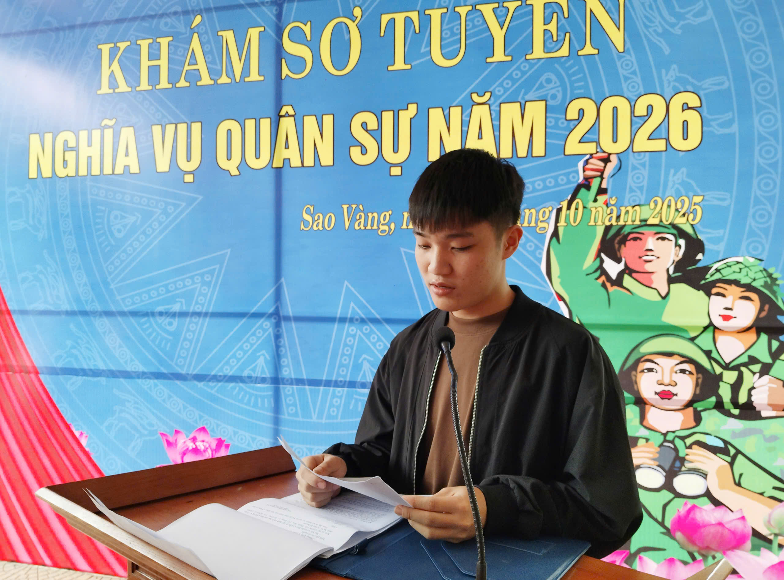 (Thanh niên Phạm Kiên Giang đại diện các nam thanh niên tham gia khám sơ tuyển NVQS năm 2026 phát biểu cảm tưởng)