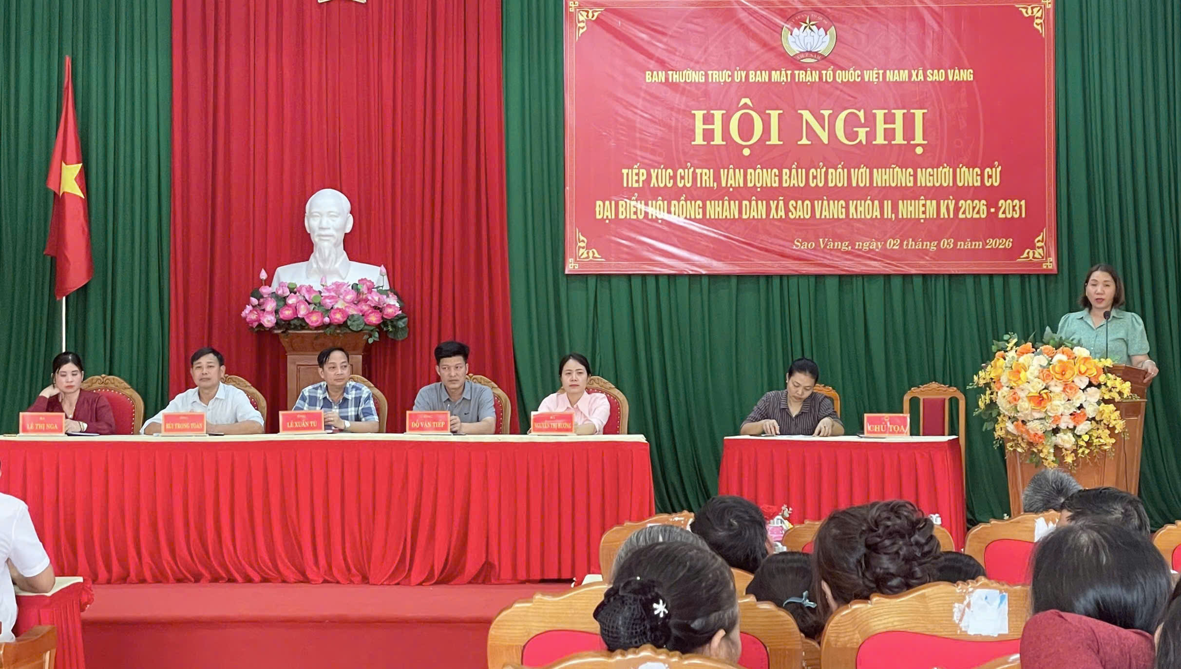 Chiều ngày 02/3, tại Hội trường UBND xã Sao Vàng, Ban Thường trực  Ủy ban MTTQ Việt Nam xã Sao Vàng đã tổ chức hội nghị tiếp xúc cử tri, vận động bầu cử đối với những người ứng cử đại biểu HĐND xã khóa II, nhiệm kỳ 2026 - 2031 thuộc đơn vị bầu cử số 04, gồm các ông, bà: Lê Xuân Tú, Ủy viên Ban Thường vụ Đảng ủy, Phó Chủ tịch UBND xã; Bùi Trọng Toàn, Phó Trưởng ban Kinh tế - Ngân sách, Hội đồng nhân dân xã; Đỗ Văn Tiếp, Công chức Hội đồng nhân dân xã; Lê Thị Hương, Công chức Trung tâm phục vụ Hành chính công xã; Lê Thị Nga, Thôn trưởng thôn 8.