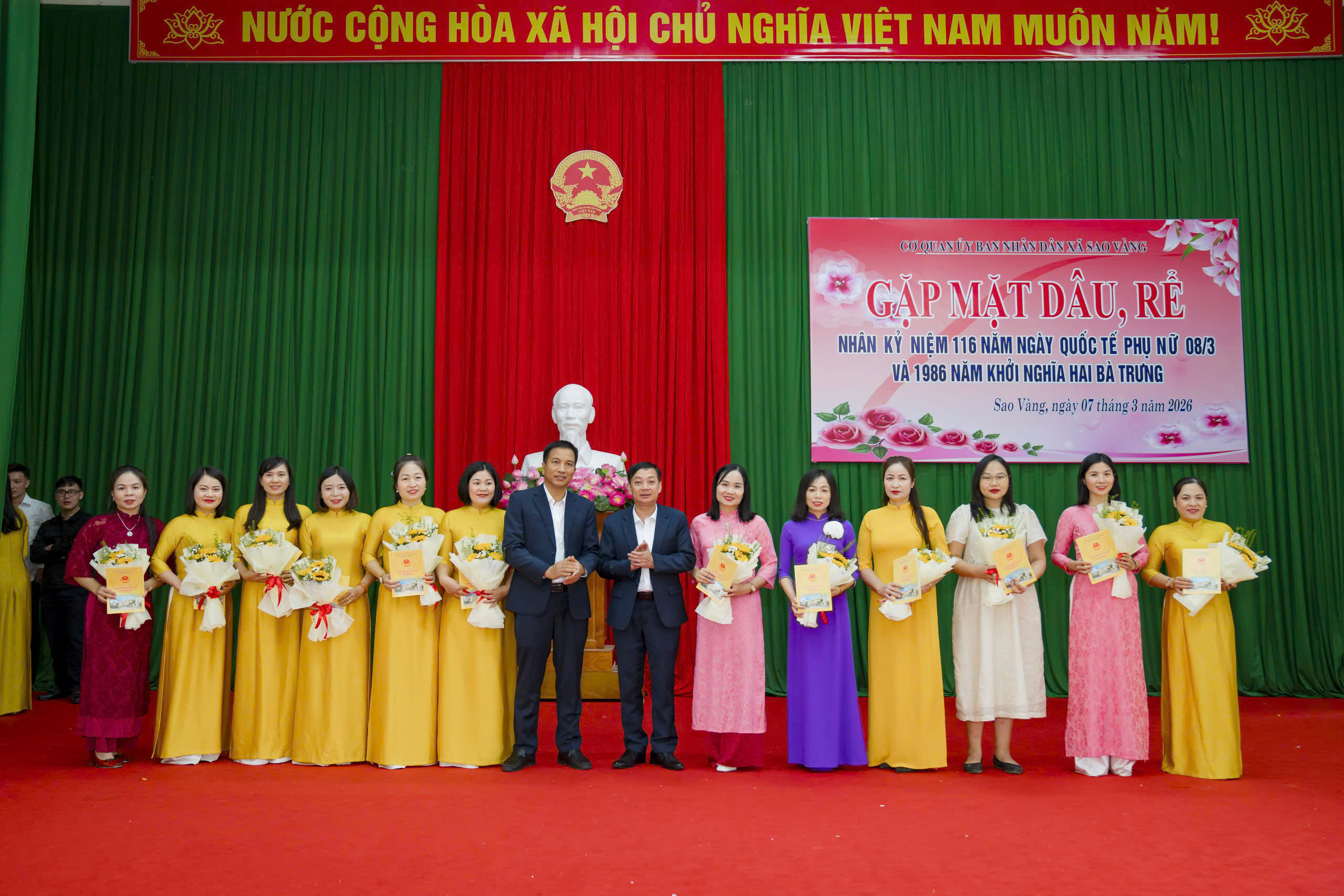 Nhân kỷ niệm 116 năm Ngày Quốc tế Phụ nữ (8/3/1910 – 8/3/2026), sáng 07/3/2026, cơ quan UBND xã Sao Vàng tổ chức buổi gặp mặt dâu, rể nhằm tôn vinh vai trò của phụ nữ và tăng cường sự gắn kết giữa các gia đình cán bộ, công chức, viên chức, người lao động trong cơ quan.