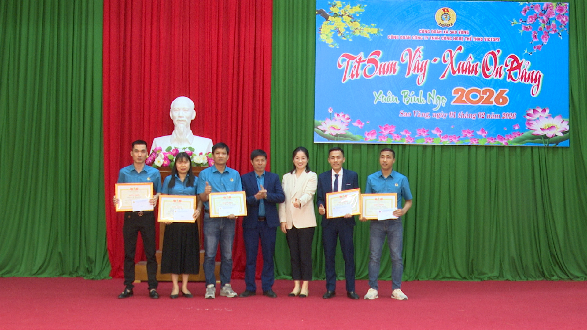 Chiều 01/02/2026, Công đoàn xã Sao Vàng phối hợp với Công đoàn Công ty TNHH công nghệ thể thao Victory tổ chức Chương trình “Tết sum vầy – Xuân ơn Đảng” năm 2026 nhằm chăm lo đời sống vật chất, tinh thần cho đoàn viên, người lao động, đặc biệt là các đoàn viên có hoàn cảnh khó khăn trên địa bàn xã nhân dịp Tết Nguyên đán Bính Ngọ 2026.