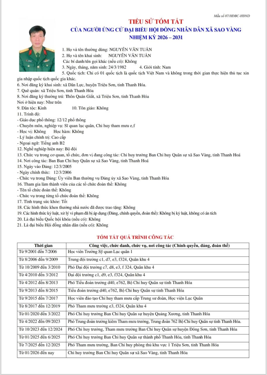 Công khai tiểu sử tóm tắt của các ứng cử viên đại biểu Hội đồng nhân dân xã Sao Vàng khóa II, nhiệm kỳ 2026 - 2031 tại đơn vị bầu cử số 7