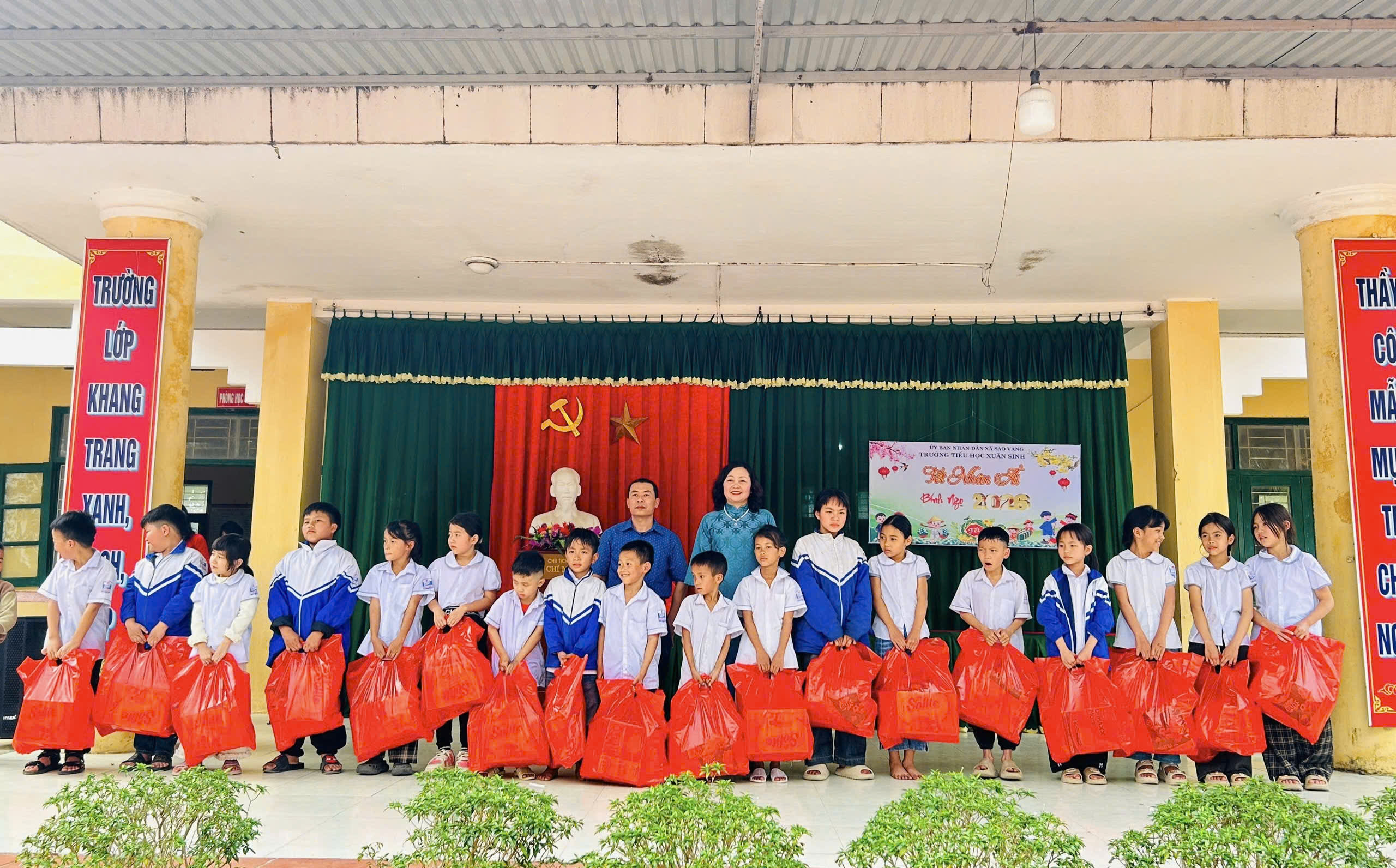 Cùng chuỗi hoạt động nhân dịp Tết Nguyên đán Bính Ngọ 2026, Trường Tiểu học Xuân Sinh phát động chương trình ủng hộ “Tết nhân ái” và tổ chức trao 56 suất quà, trị giá 300.000 đồng/suất cho học sinh thuộc hộ nghèo, hộ cận nghèo, học sinh khuyết tật, mồ côi. Cùng dịp này, Đoàn Thanh niên xã Sao Vàng cũng trao 10 suất quà, mỗi suất trị giá 200.000 đồng cho học sinh có hoàn cảnh khó khăn của nhà trường.