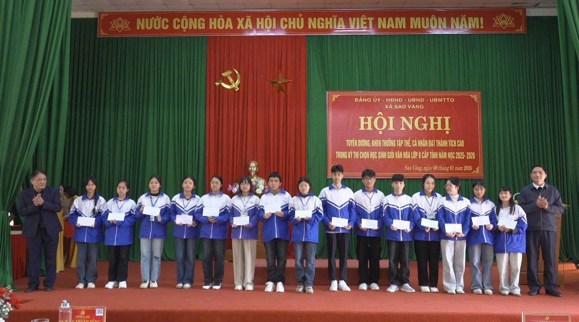 Sáng 8/1/2026, xã Sao Vàng tổ chức tuyên dương, khen thưởng tập thể, cá nhân đạt thành tích cao trong kỳ thi chọn học sinh giỏi các môn văn hóa lớp 9 cấp tỉnh năm học 2025- 2026.